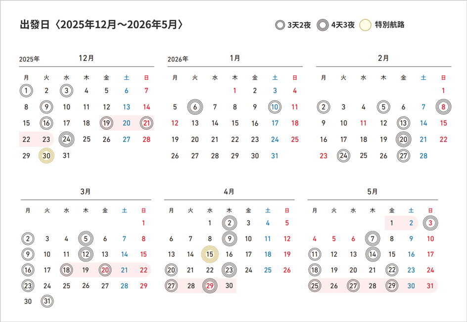 尾道出發 3天2夜 / 4天3夜 位於廣島縣尾道市的「Bella Vista Marina 碼頭」出發,將穿梭在瀨戶內海區域的島嶼之間,能夠感受航海樂趣的行程。 2025年12月至2026年5月期間,「3天2夜」或「4天3夜」,共有8種行程可供選擇。 行程會因出發日期不同而有所差異。 所有行程皆包含一次自由參加的下船體驗,讓您感受當地獨特的文化。 ※ 行程詳情請參閱官方手冊: 日文 、 英文 ※ 因本商品為當地行程 (個人自由行),行程中無安排領隊或導遊隨行。 ※ guntû 工作人員僅提供日文及英文對應服務。 ▶ 欲參加台灣領隊隨行團體,請參閱【2026/03/24出發 創造旅遊包船行程】 參考出發日 ※ 在收到您的詢問後,我們會向 guntu 確認空房狀況。若因客滿而無法受理預訂,敬請見諒。