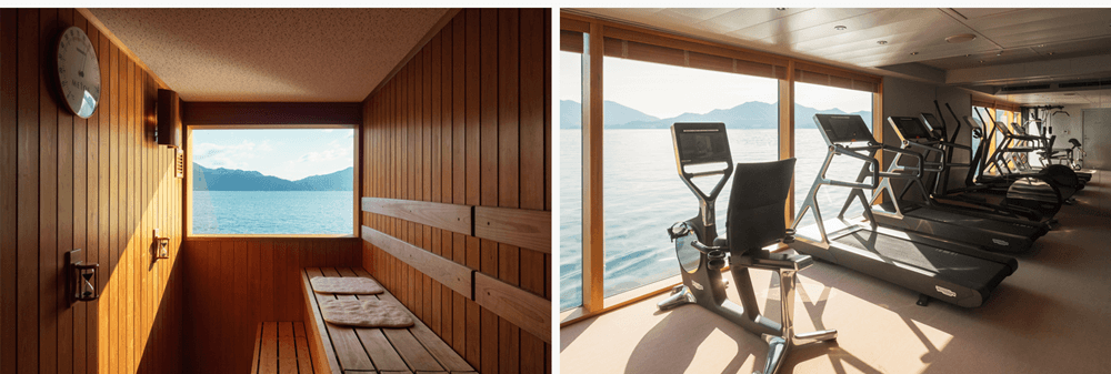 其 他 設 備 │ 大浴場、三溫暖、健身房 位於Deck2 (2樓) 船尾的 Spa Area,設置健身房、附有三溫暖的浴場 (每日男女湯位置交換)、按摩SPA。 按摩SPA可另外付費享受美容、整體治療等服務。 ※ 按摩SPA的費用、內容等詳情請在登船後與現地工作人員確認。 │ 開放式露天甲板 水平線上浮現小島飄瞟的倒影,夢幻般的日出、燃燒般夕陽和寂靜的月光。 站在開放式露天甲板上,清爽的涼風吹拂而過,盡情感受旅途中的樂趣。