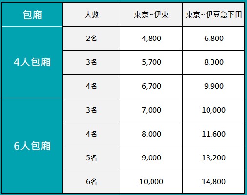※ 根據人數變動價格而有所變化,下列為單程,利用人數/一室價格。