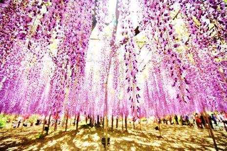 ●【栃木足利紫藤公園】最具代表的花卉,屬於多年生藤蔓植物,莖具纏繞性,直徑達10公分以上,常被用作棚架觀賞植物(花期4月中旬至5月中旬)總狀花序側生在枝端,20~30朵紫色小花整齊排列,開花時蝶形花朵成串下垂,長度可達15~30公分,花量大時彷彿紫色瀑布,美得令人屏息。公園裡的紫藤約300棵,每逢盛開時聲勢驚人,被公認是全世界最漂亮的紫藤花美景,園內最受矚目的「大藤」、「白藤通道」、「八重黑龍大藤」,甚至被列為栃木縣指定天然紀念物。「大藤」是園區的主打招牌,共有3株,樹齡已超過130年,它的藤架範圍廣達600個榻榻米,垂掛的花穗就像瀑布,非常壯觀!稀有的「八重黑龍大藤」花朵為重瓣,遠遠看每串花就像一串葡萄,而且香氣濃郁。「白藤通道」長80公尺,密生的花穗讓人感受無比柔美與幸福。