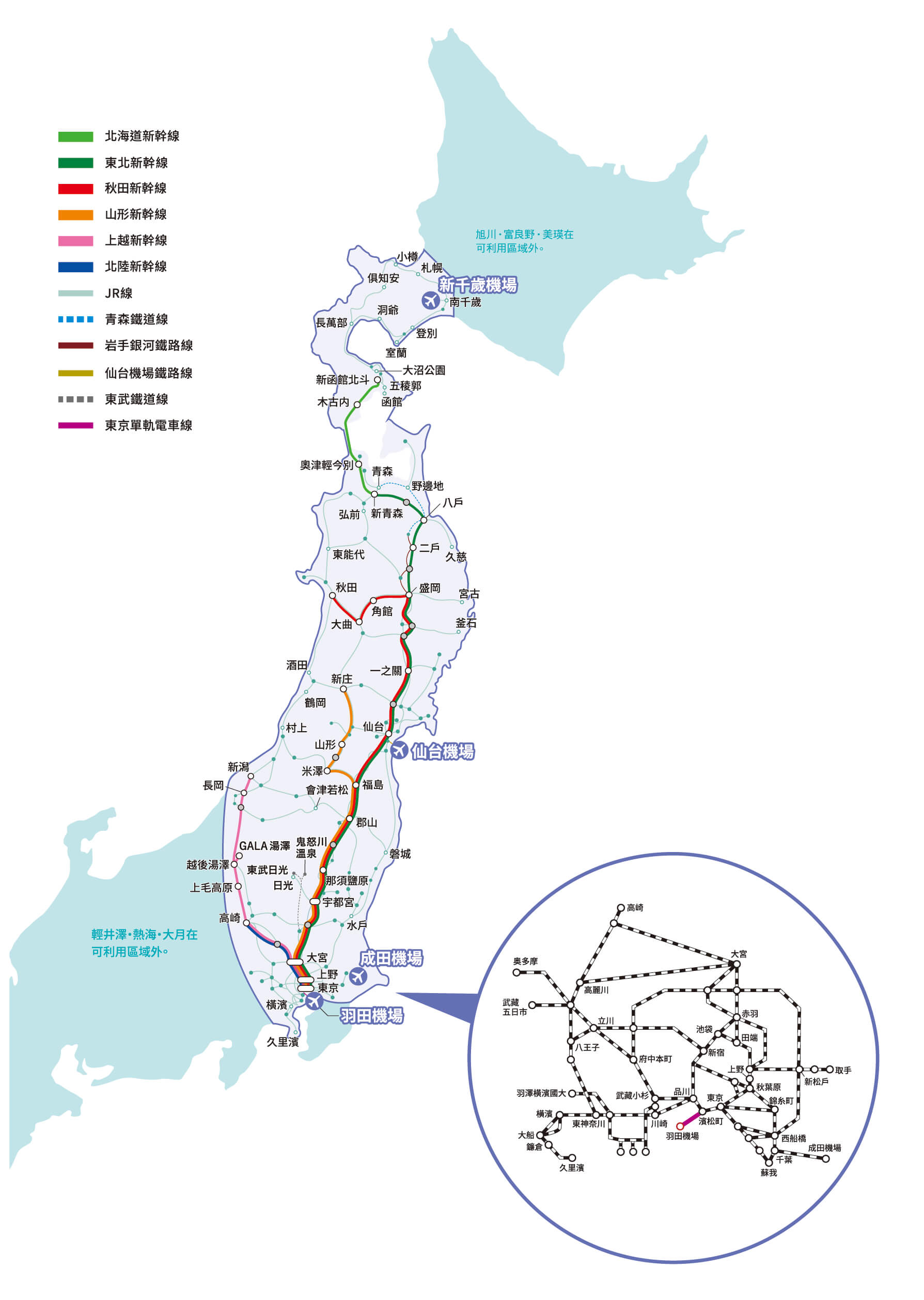 ・JR東日本線(含成田特快NEX) ・JR北海道線 ・伊豆急行線全線 ・東京單軌電車線全線 ・青森鐵道線全線 ・IGR 岩手銀河鐵道線全線 ・仙台機場鐵道線全線 ・東武鐵道線相互直通的特快列車「日光號」、「SPACIA 日光號」、 「鬼怒川號」、「SPACIA 鬼怒川號」等的普通車指定席。 ・東武鐵道線下今市~東武日光、鬼怒川溫泉間的普通列車(含快速)亦可搭乘。 「栗橋~下今市間」僅可搭乘與東武鐵道互通直達的特快列車。 ※若需在栃木站、新鹿沼站、下今市站、東武日光站、東武世界廣場站、鬼怒川溫泉站搭乘特快列車,則始發站或終點站須為JR線車站。 兌換地點請見 JR東日本 周遊券詳情請見 JR東日本官網。